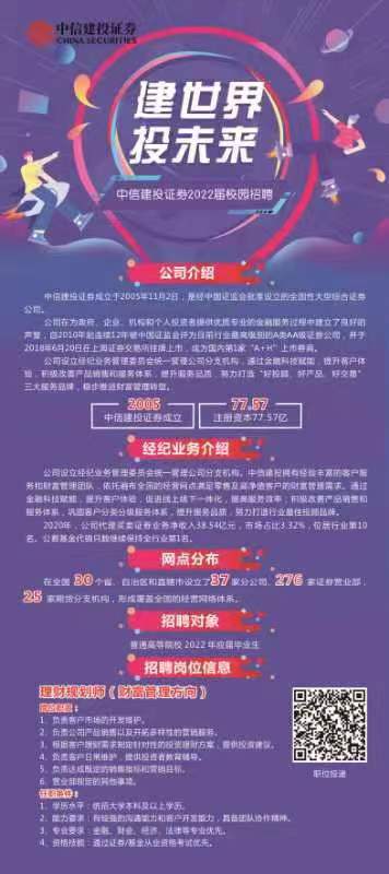 福利待遇:基本工资(5.6-8.6k)+业绩提成+优厚福利(六险二金+过节费+工会福利+节日物资+年度体检+拓展活动+午餐补助+周末双休+证券行业隐形假期…)