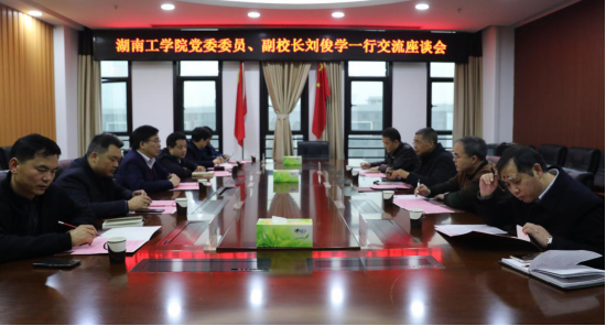 刘俊学一行受到湖南文理学院党委委员、副校长郭国强,党委委员、组织部长戴军热情接待,双方湖南文理学院逸夫楼B704进行了深入交流。刘俊学表示此行目的主要是就学校“十四五”规划制定、教育教学以及双创等工作向兄弟院校学习取经,希望进一步密切两校的联系,在相互交流、共同进步。郭国强对刘俊学一行的到来表示欢迎,并向与会人员介绍了湖南文理学院教育教学、督评、专业建设、学科竞赛双创等方面的情况他希望两校加强交流,互相学习。
