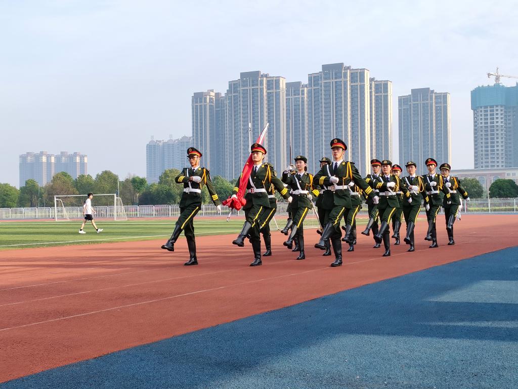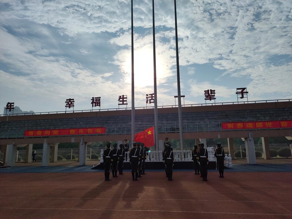 晨光中,英姿飒爽的国旗护卫队踏着整齐划一、铿锵有力的步伐护送五星红旗走向升旗台,伴随着庄严的国歌,五星红旗冉冉升起,在熠熠晨光中迎风飘扬全体师生注目礼深怀对祖国无限的热爱和崇高的敬意。
