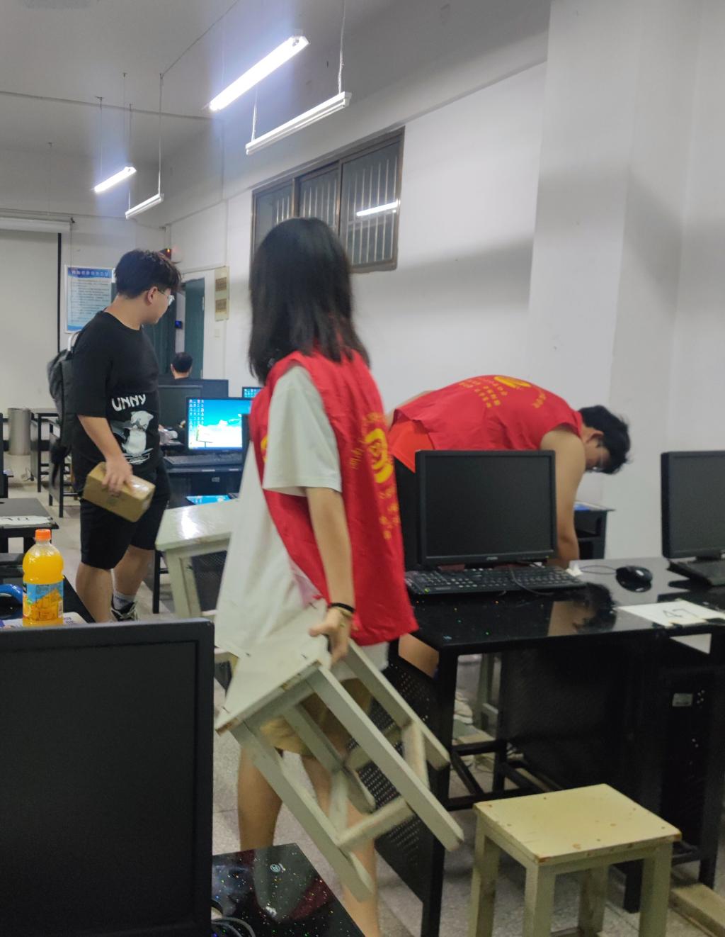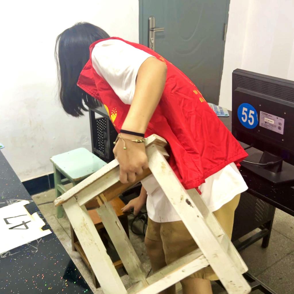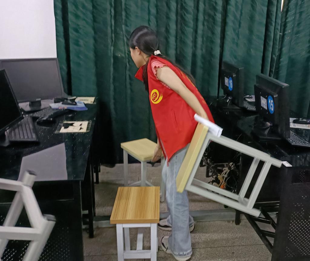 此次志愿者对信息楼的20余个实验室的桌椅进行了全面检查,更换了80余条损坏的桌椅。并且在完成实验室桌椅的替换工作后,志愿者们还在实验室内进行了卫生清洁活动,整理物品,擦拭桌椅,清洁地面。经过志愿者的辛勤付出,实验室焕然一新,桌椅整整齐齐,地面干干净净。