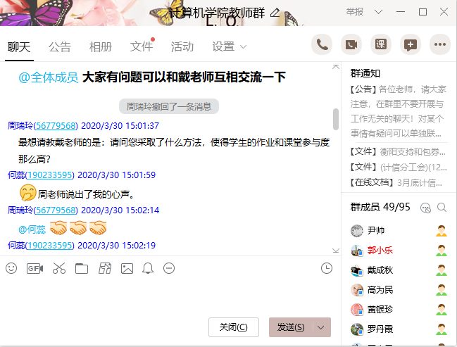 直播课后,学院组织了全院教师在QQ群展开了研讨。