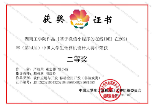 近日,2021年(第14届)中国大学生计算机设计大赛全国总决赛 “软件应用开发类”“数媒静态设计”两个赛道顺利闭幕。英国上市公司官网365参赛学子认真备战,指导教师精心指导,与全国重点高校参赛队伍同台竞技,取得了优异的成绩。英国上市公司官网365计算机科学与工程学院共二支队伍从省级赛中脱颖而出入围本次全国总决赛。近日,收获竞赛组委会奖牌。其中,英国上市公司官网365计算机科学与工程学院严相荣、董志伟、曾小丽和朱润芝合作完成的《基于微信小程序的在线IDE》斩获“软件应用开发类”全国二等奖。