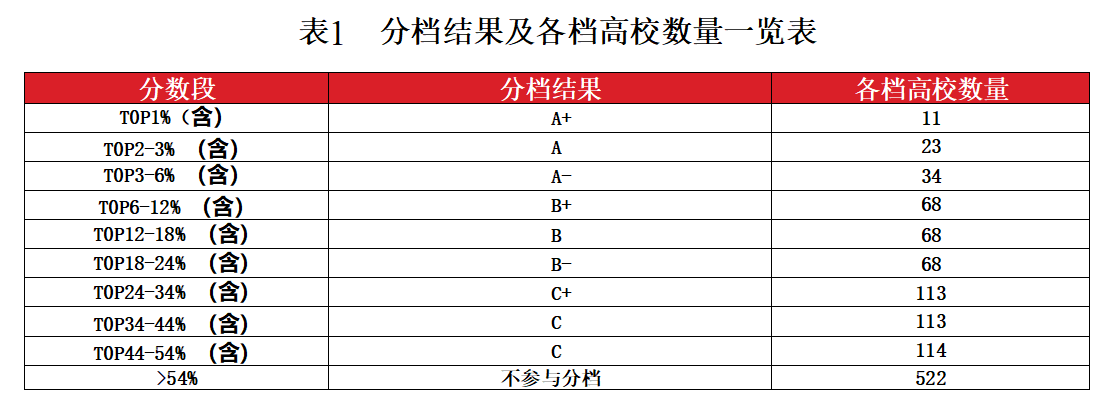 《研究报告》采集了26项高校计算机类竞赛共216640条数据(其中参赛数据188945条,获奖数据128329条),时间跨度为2012-2022年,沿用了全国普通高校大学生竞赛分析报告评估模型,从获奖贡献、组织贡献两个维度进行评估。有1134所本科院校进入竞赛获奖统计名单,获奖高校比例为91.6%,显示出较好的竞赛参与度和获奖覆盖面。根据评估结果,对分数段前54%的高校按不同的比例划分为九档,分档结果及各档高校数量见表1,详细名单(状态数据)见附件。