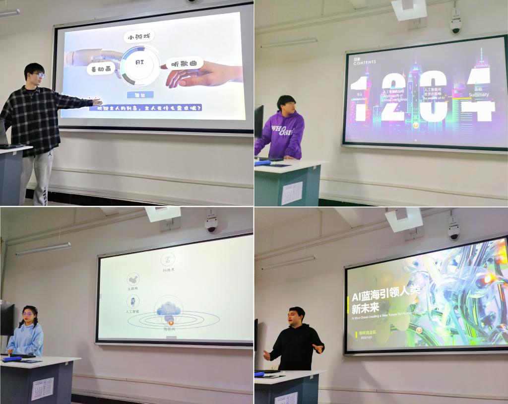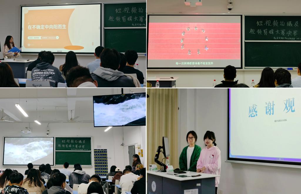 比赛得到了同学们的积极响应和热情参与,同学们发挥创新思维,制作的视频形式多样、主题鲜明、饱含正能量,从小视角折射大思考,不仅诠释了当代大学生对学习生活的独特见解,更倾注了对社会、人文、情感的关注与思考;制作的PPT以“AI为新蓝海,人类新未来”为主题,运用动画、视频等各种制作技巧,从不同的角度诠释了人工智能时代AI在生活里的广泛应用。评委对作品进行了一一的点评,或一针见血,或温柔鼓励,或耐心指导,并从作品的内容、设计、技术性及艺术性给出了建设性意见。