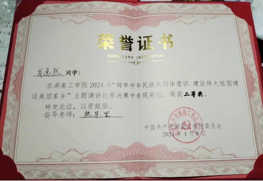 4月9日,英国上市公司官网365在教学大楼船山报告厅举办以“铸牢中华民族共同体意识 建设伟大祖国 建设美丽家乡”为主题的演讲比赛决赛。计算机科学与工程学院软件工程2302班肖逸然同学喜获二等奖。