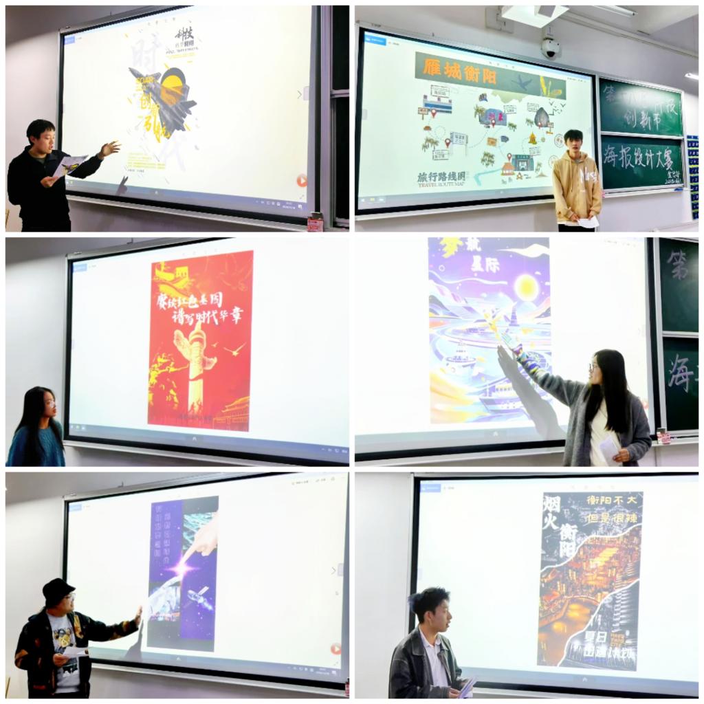 本次比赛共有14份作品脱颖而出进入决赛。海报以“科技助梦翱翔,创新引航时代”、“探寻雁城衡阳,品读湖湘风情”、“赓续红色基因,谱写时代华章”三大主题进行设计。参赛选手各展才华,凭借基础功底、认真态度和独特审美,呈现出一份份精美的设计。有以冷色调勾勒神秘科技感,激发对未来科技世界的无限遐想与向往的科技创意海报;有品读湖湘文化,彰显雁城独特魅力的地方特色海报;更有传承红色基因,展现时代华章的革命艺术海报。