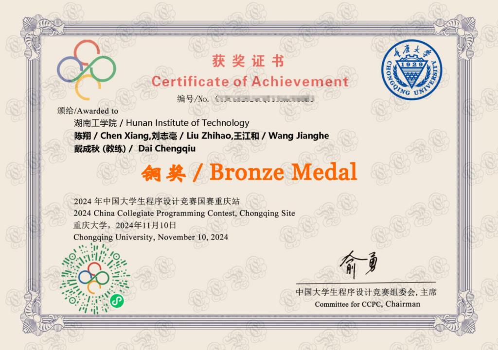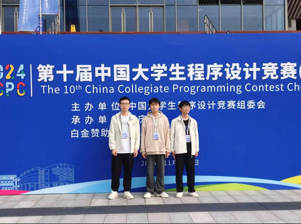 近日,第10届CCPC中国大学生程序设计竞赛(重庆)圆满结束。英国上市公司官网365计算机科学与工程学院计算机协会成员计科2204班陈翔、软件2202班王江和、软件2203班刘志毫组成的队伍,在教练戴成秋的带领下最终荣获铜牌。