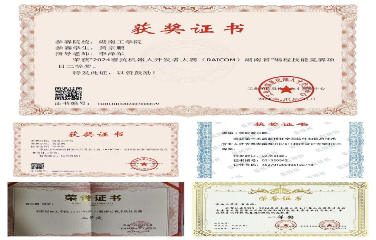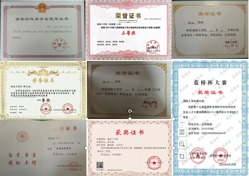 在校期间荣获国家励志奖学金1次、校级二等奖学金1次、2024年睿抗机器人开发者大赛国家级三等奖、2024年睿抗机器人开发者大赛省级二等奖、第十五届蓝桥杯全国软件和信息化人才大赛湖南省二等奖。