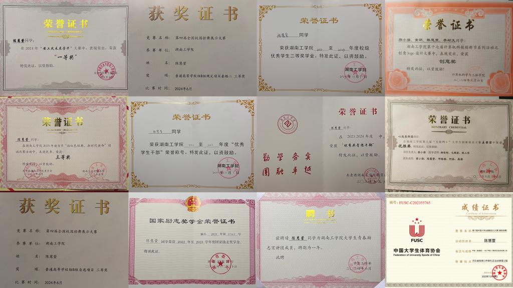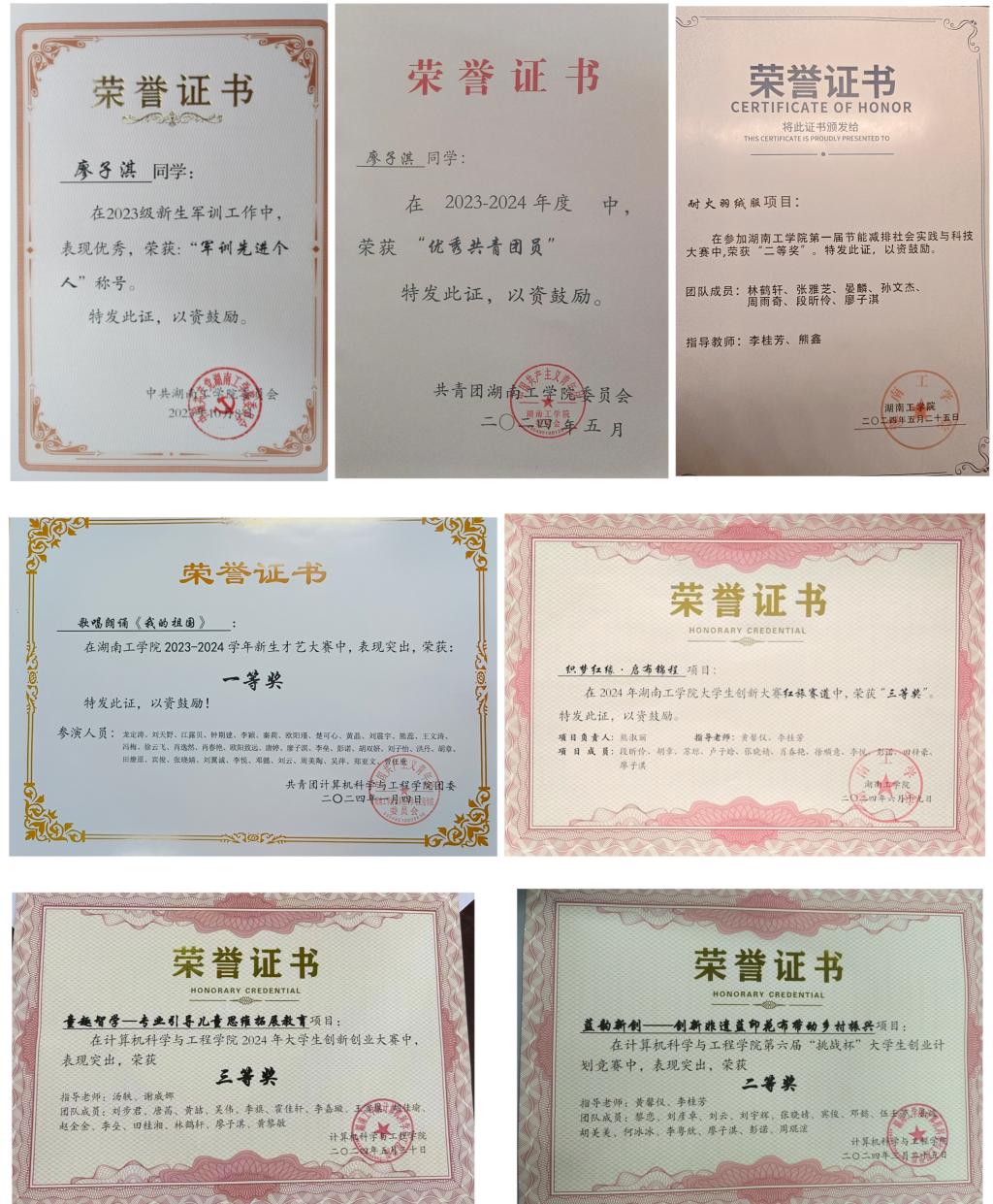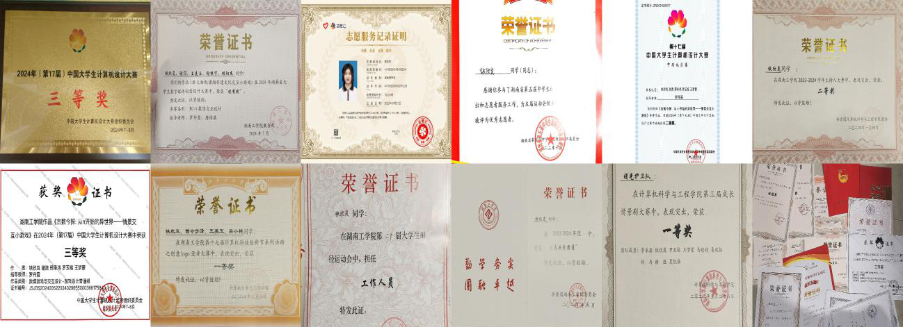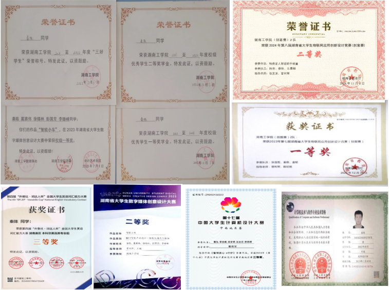 荣获国家励志奖学金1次、校级一等奖学金2次、校级二等奖学金1次、校级三好学生2次。积极参与学科竞赛,荣获第七届湖南省物联网竞赛省一等奖、第八届湖南省物联网竞赛省二等奖、数字媒体创意设计大赛省二等奖、中国大学生计算机设计大赛省三等奖。主持国家级大创项目一项并发表省级学术论文一篇、参与一项省级大创项目等,累计获得省级以上荣誉8项。