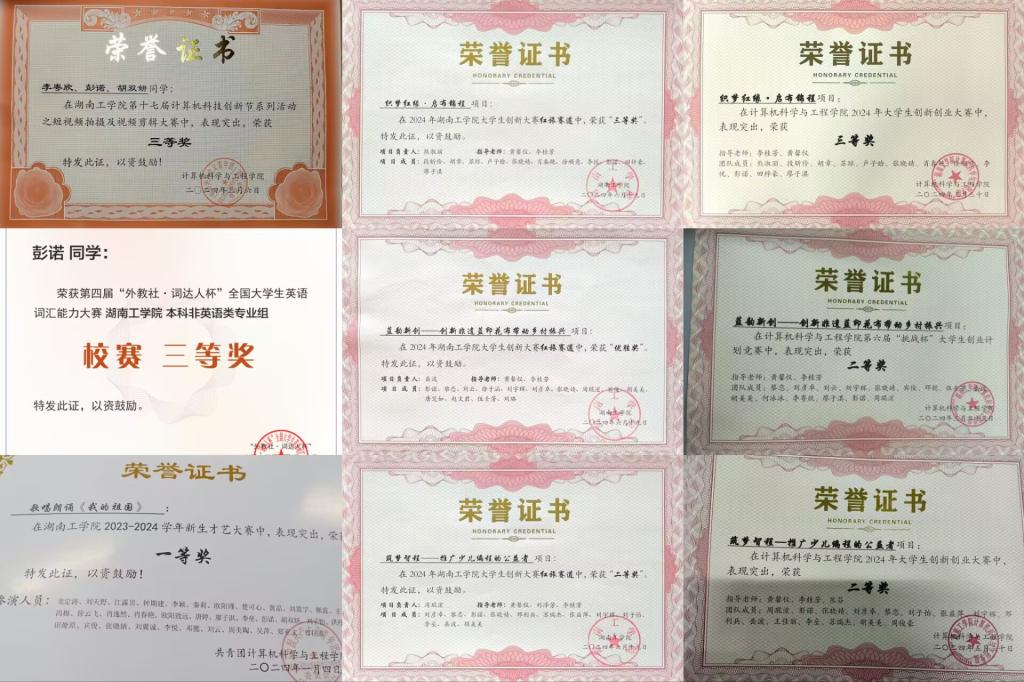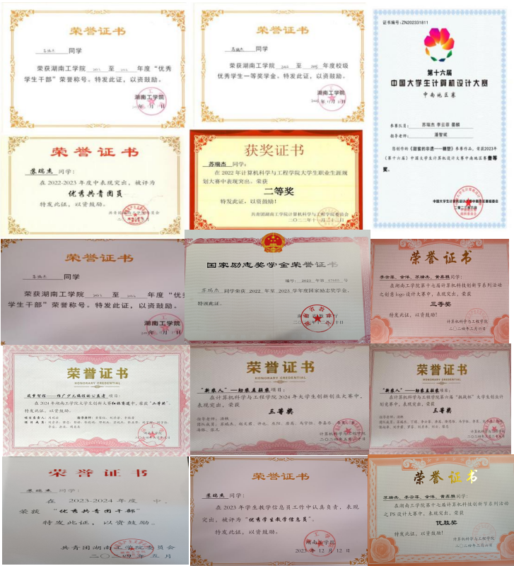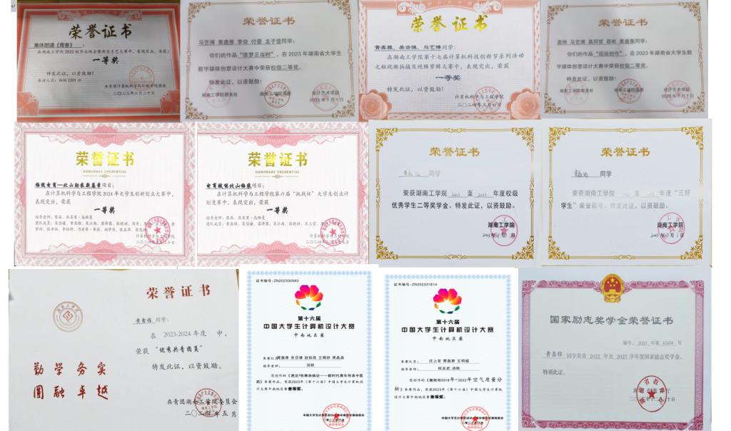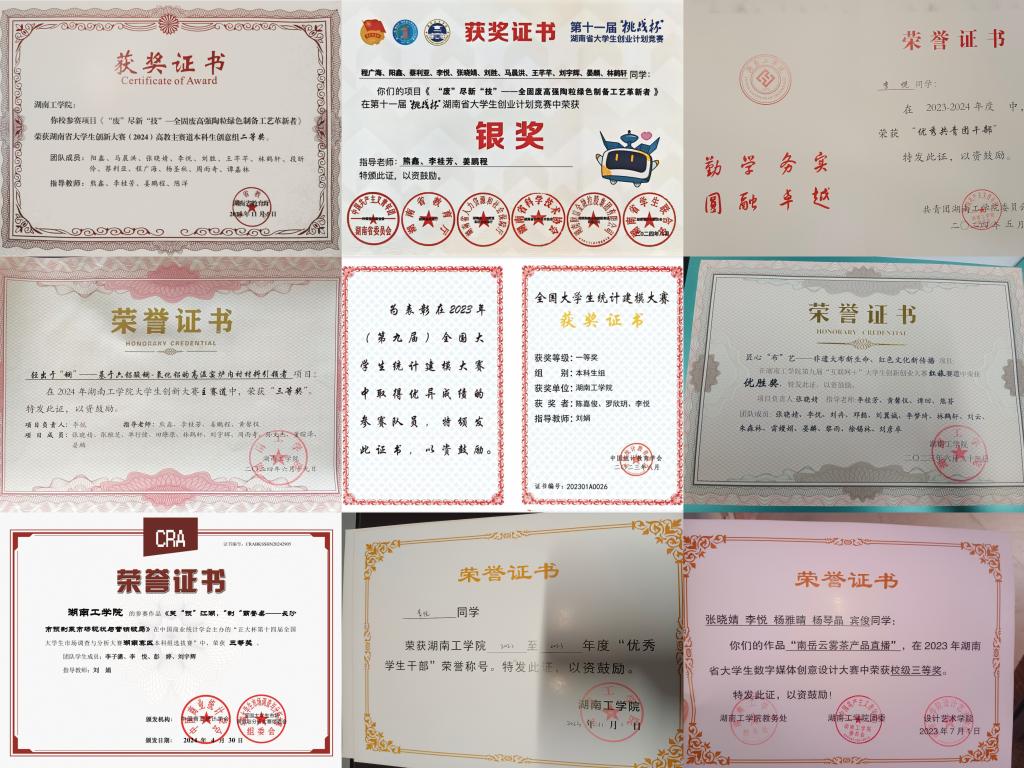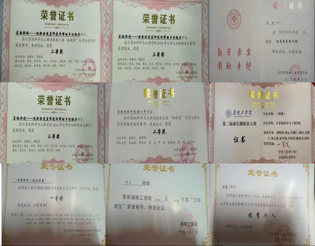 荣获国家励志奖学金1次、校级一等奖学金2次、校级二等奖学金1次、校级三好学生2次。积极参与学科竞赛,荣获第七届湖南省物联网竞赛省一等奖、第八届湖南省物联网竞赛省二等奖、数字媒体创意设计大赛省二等奖、中国大学生计算机设计大赛省三等奖。主持国家级大创项目一项并发表省级学术论文一篇、参与一项省级大创项目等,累计获得省级以上荣誉8项。