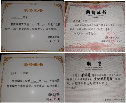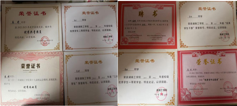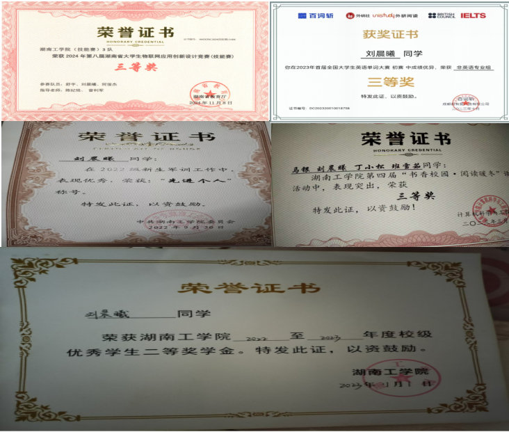 荣获国家励志奖学金1次、校级二等奖学金2次、校级优秀学生干部1次。在校期间积极参加各类比赛活动并获得相关荣誉,在第八届湖南省大学生物联网应用设计比赛中获得三等奖等。