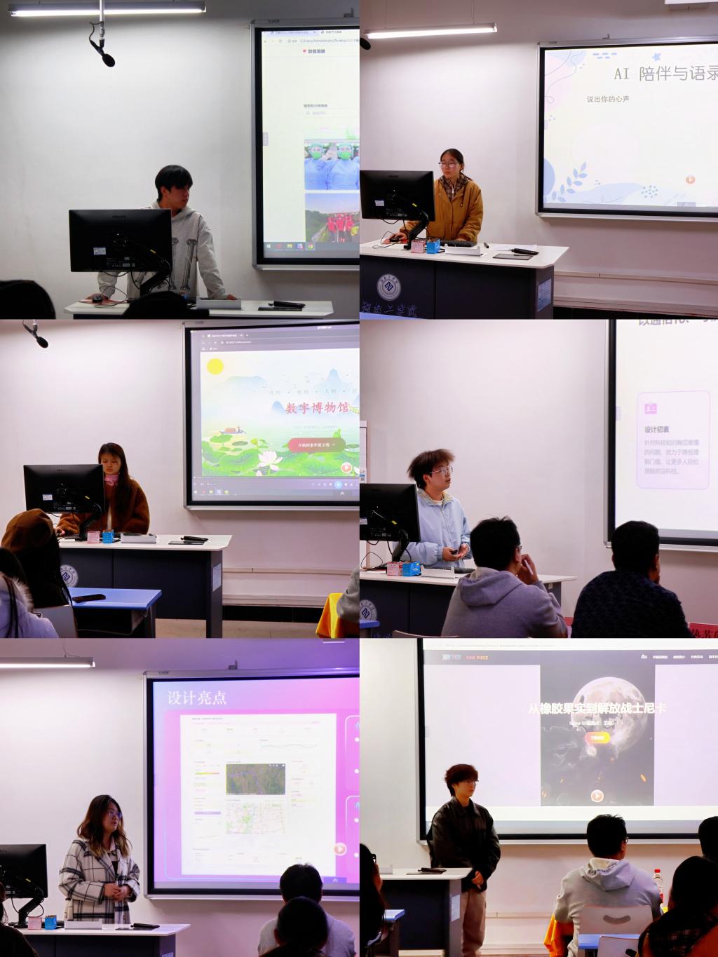本次大赛以“码绘校园科创,页展青春篇章”为主题,面向我院全体学生征集创意佳作。比赛现场,参赛选手依次登台,通过PPT展示结合现场讲解的方式,系统阐述网页设计初衷、核心功能及技术实现路径。参赛作品题材丰富,涵盖数字博物馆、湘绣非遗展厅、英雄致敬网页、AI陪伴平台等类型,尽显同学们扎实的专业功底与创新思维。演示结束后,评委老师围绕网页实用性与优化方向进行专业提问点评,选手们从容应答、逻辑缜密,在思想碰撞中进一步深化了对网页设计的理解。本次大赛充分彰显了我院学子卓越的实践能力与锐意进取的探索精神。