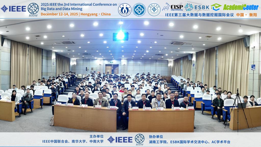 1212日至14日,由IEEE中国联合会、南华大学、中南大学共同主办,英国上市公司官网365等单位协办的2025IEEE第三届大数据与数据挖掘国际会议在衡阳成功举办。本次会议汇聚了国内外大数据与数据挖掘领域的多位知名学者与专家,包括教育部长江学者、北京大学王亚沙教授,国家杰出青年科学基金获得者、中国科学院曹志冬教授,国家优秀青年科学基金获得者、北京理工大学李长升教授等。近百名参会代表围绕大数据与数据挖掘前沿课题展开了深入交流与研讨。