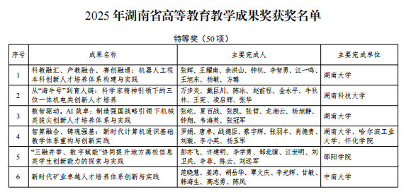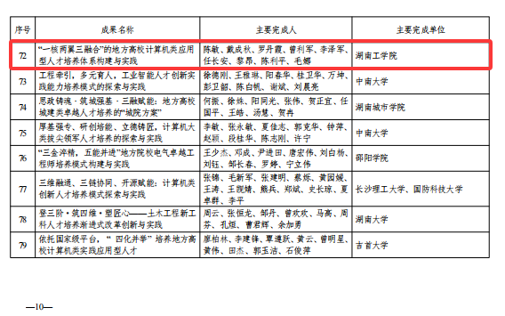 近日,湖南省教育厅正式发布了《关于2025年湖南省高等教育教学成果奖获奖名单的通知》。全省共评选出特等奖50项、一等奖175项、二等奖273项。我院在此次评选中喜获佳绩,陈敏教授主持的《“一核两翼三融合”的地方高校计算机类应用型人才培养体系构建与实践》荣获湖南省高等教育教学成果一等奖。
