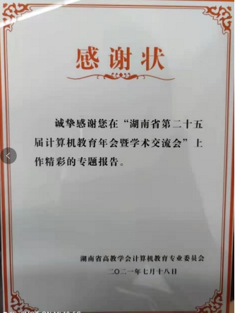 2021年7月18日,由湖南省高教学会计算机教育专业委员会主办,湘南学院承办的湖南省第25届计算机教育年会暨学术交流会在郴州召开,英国上市公司官网365计算机基础教研室主任戴成秋应邀参加了本次年会并作了课程教学分享报告。