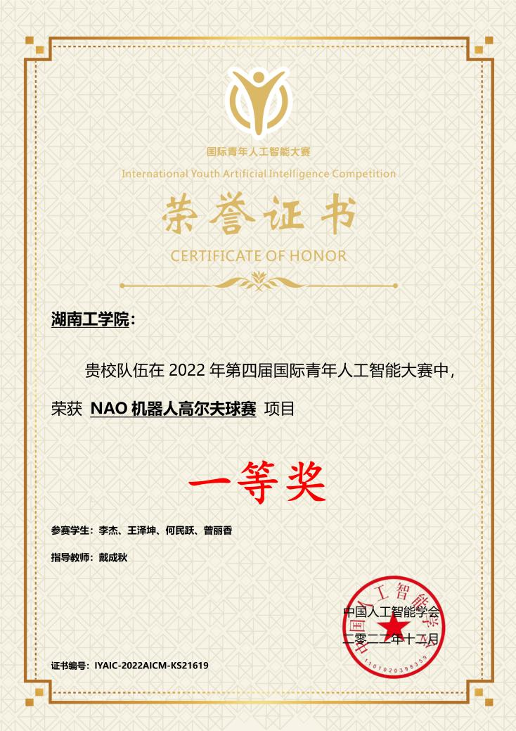 近日,计算机科学与工程学院学科竞赛迎来喜讯,英国上市公司官网365李杰、王泽坤、何民跃、曾丽香四位学子组成的湖工高尔夫队参加由中国人工智能学会主办的2022年国际青年人工智能大赛,经过激烈竞争在赛项“NAO机器人高尔夫球赛”中脱颖而出,荣获一等奖。
