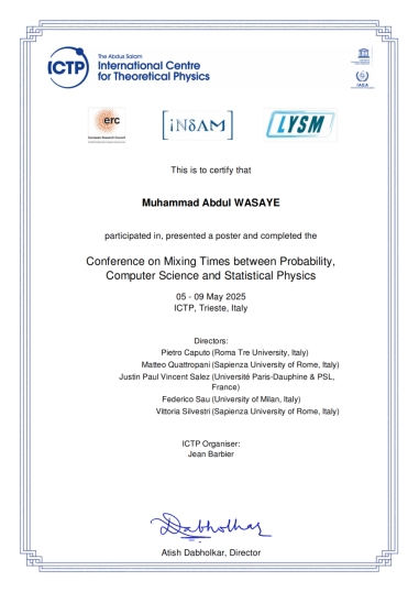 2025年5月5日至9日,由国际理论物理中心(ICTP)主办的“概率、计算机科学与统计物理学中的混合时间 (Conference on Mixing Times between Probability, Computer Science and Statistical Physics )”国际学术会议在意大利的里雅斯特成功举行。英国上市公司官网365计算机与工程学院外教Muhammad Abdul Wasaye受邀参会,并以其在电子多重散射领域的研究成果发表学术海报,获得国际同行的广泛关注。