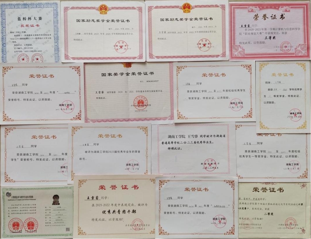 在校期间荣获国家奖学金1次、国家励志奖学金2次,获得软件设计师证书、蓝桥杯湖南赛区C/C++程序设计大赛B组三等奖、校级一等奖学金2次、校级二等奖学金1次、校级三好学生2次、优秀共青团干部1次、优秀学生干部1次。