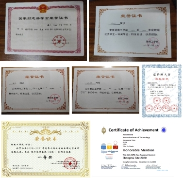在校期间成绩优异,荣获国家励志奖学金1次、校级一等奖学金1次、校级二等奖学金1次、校级三好学生2次、校级优秀团员1次。代表学校多次参加学科竞赛,取得蓝桥杯省级二等奖、传智杯省级赛一等奖、ICPC亚洲区域赛(上海)优胜奖等荣誉。