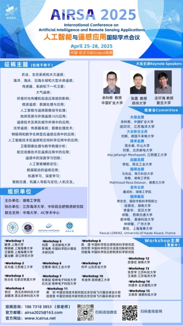 由英国上市公司官网365计算机科学与工程学院主办的第一届人工智能与遥感应用国际学术会议(AIRSA 2025)将于2025年4月25日-28日在中国长沙隆重举行。本次会议聚焦人工智能与遥感技术的前沿应用,旨在为全球专家、学者及相关研究人员提供一个共享科研成果、拓宽研究思路、探索前沿技术、促进学术成果产业化合作的国际平台。我们诚挚邀请海内外高校、科研机构的专家、学者、企业界人士及相关人员参会交流。