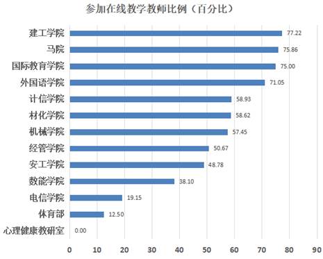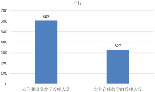 本学期全校课堂教学教师人数为605人,参加在线教学的教师人数为327人,占比54%。其中参加在线教学比例大于50%的教学单位有8各,建工学院的参与率最高,为77.22%。全校在线教学教师人次数为6114。