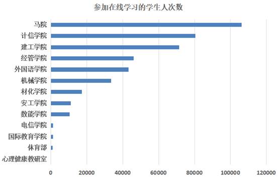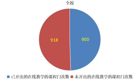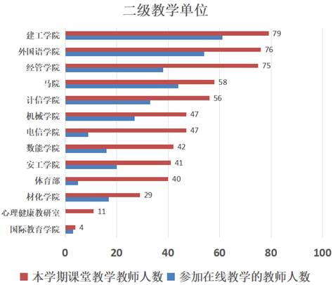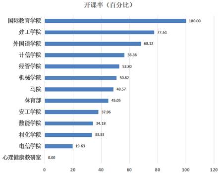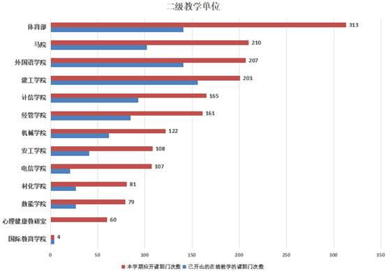 本学期全校应开课程1818门次,已开在线教学918门次,未开课程900门次,各占比例约50%。其中,开课率大于50%的教学单位有6个,分别是国际教学学院、建工学院、外国语学院、计信学院、经管学院和机械学院。