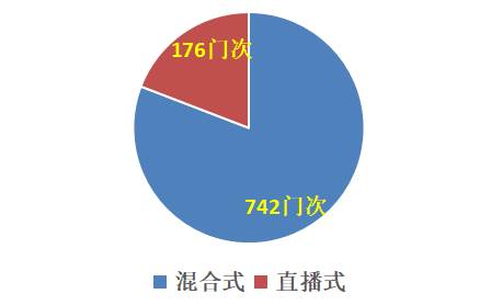 本学期全校网络教学主要有混合式和直播式两种教学方式,截至统计日,混合式课程有742门次,直播式课程有176门次。