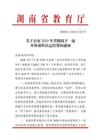 近日,湖南省教育厅发布了《关于公布2020年省级线下一流本科课程认定结果的通知》(湘教通[2020] 322号,见附件),英国上市公司官网365推荐省级的7门课程顺利通过认定,现将通知转发,请各教学单位注意查收。