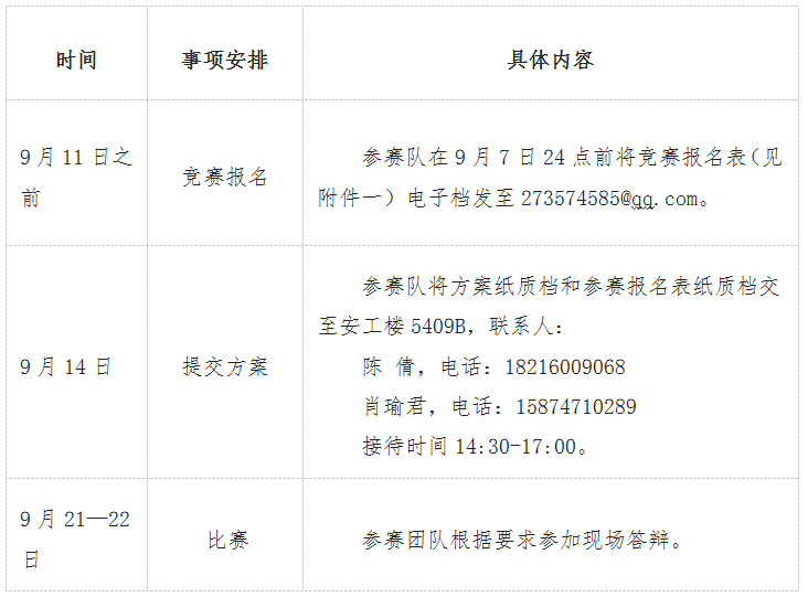 办公室主任:陈倩;竞赛办公室地址:安全与管理工程学院物流管理与工程教研室(安工楼5409B),联系人:肖瑜君(15874710289)。