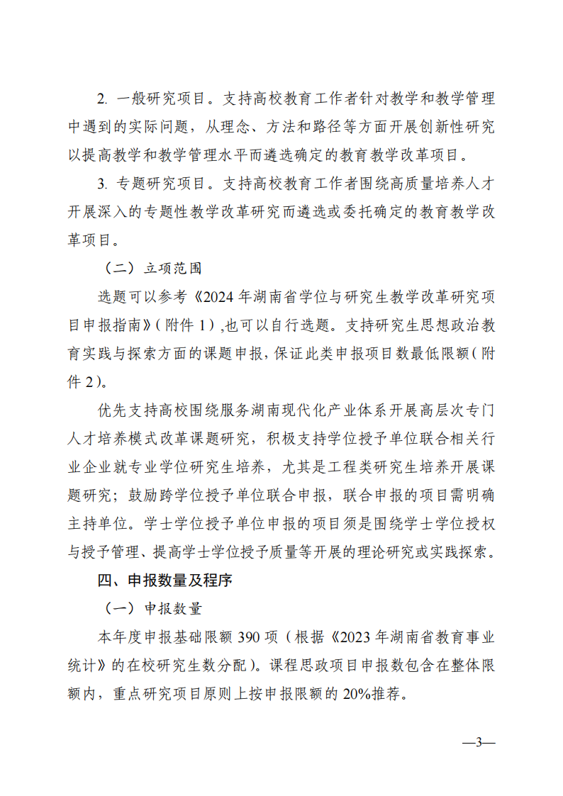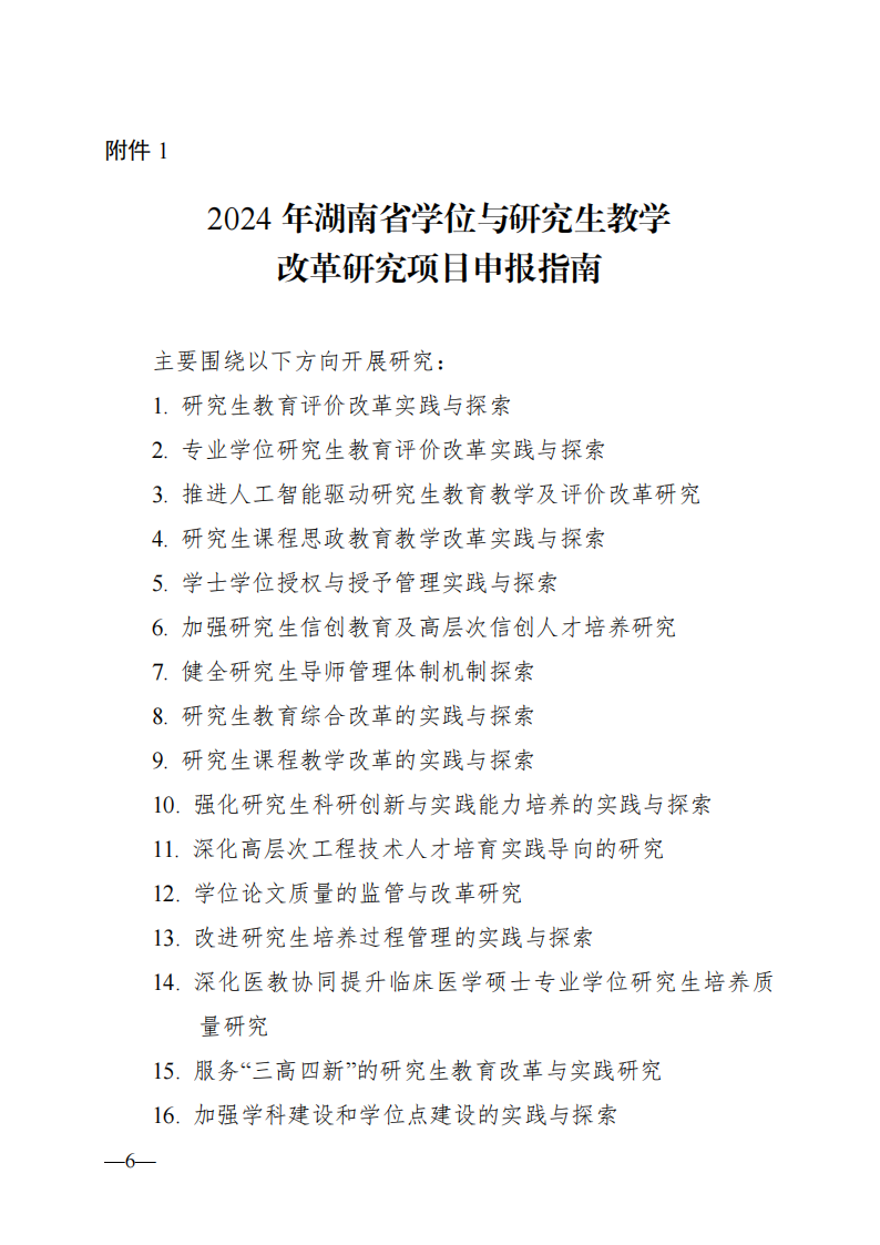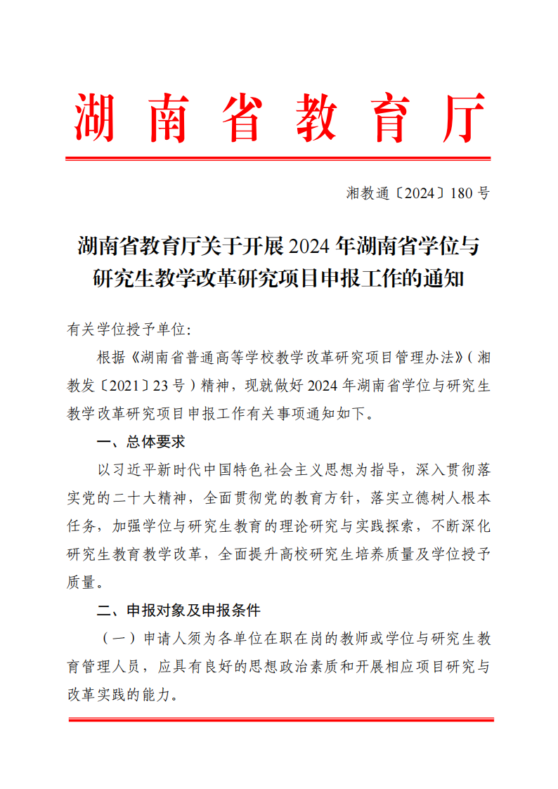 湖南省教育厅关于开展 2024 年湖南省学位与 研究生教学改革研究项目申报工作的通知
