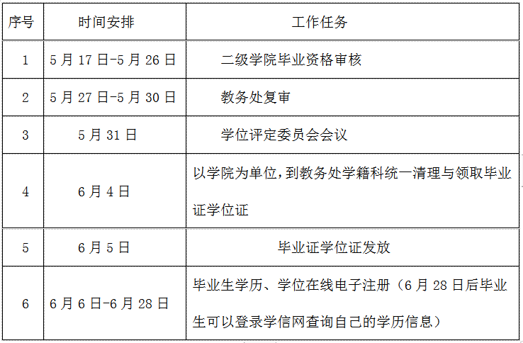 3.毕业生毕业资格审核和毕业证发放工作时间紧、任务重,请各二级学院严格按照上表规定的时间节点完成。