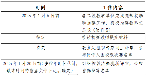 各二级教学单位根据竞赛规程自行组织初赛,初赛结果经公示后按限额推荐教师(或团队)参加校级初赛(推荐指标见附件1)。