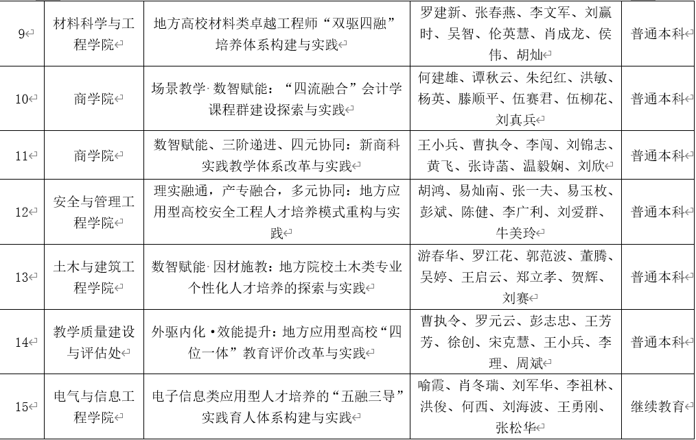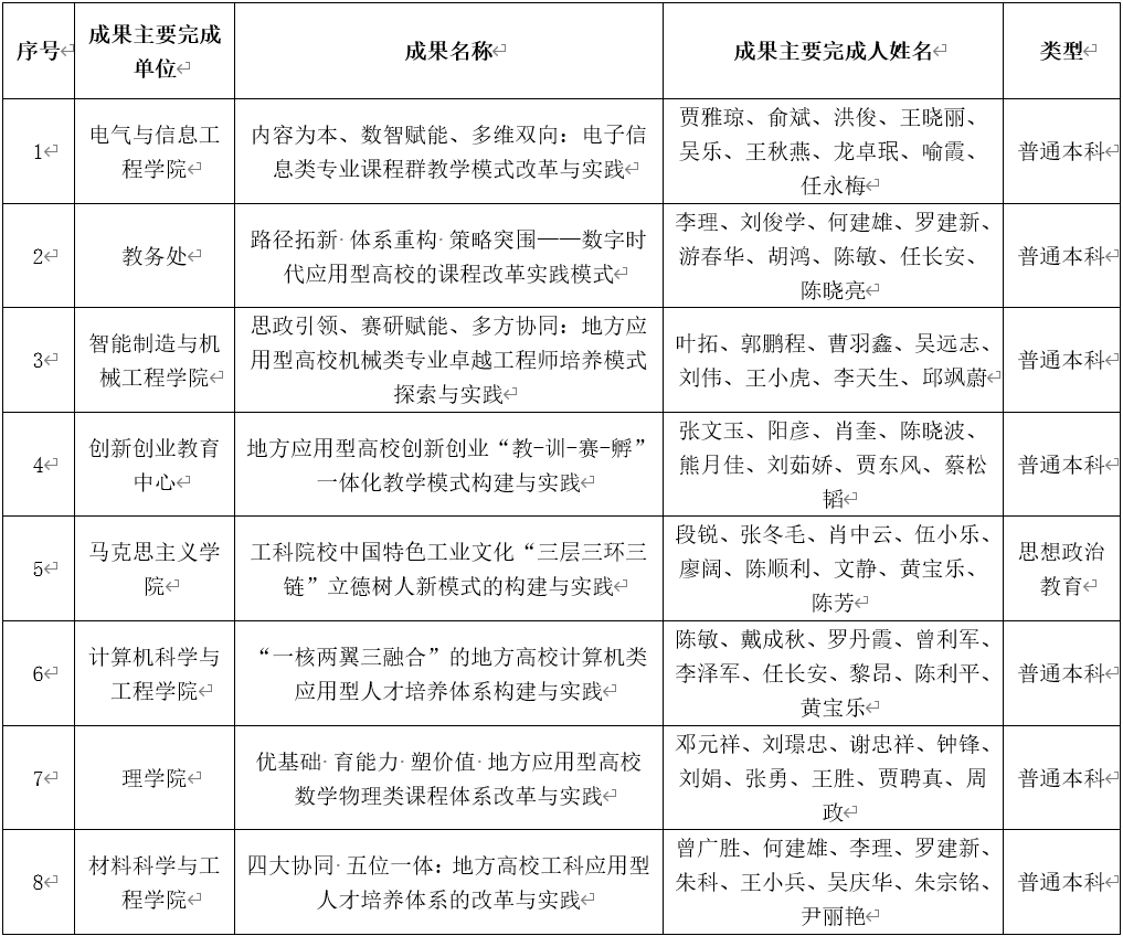根据《湖南省教育厅关于开展2025年湖南省教学成果奖评审工作的通知》(湘教通〔2025〕143号)精神,对2025年校级教学成果奖项目,组织专家分普通本科类、思想政治教育类及继续教育类的进行评议,确定推荐“内容为本、数智赋能、多维双向:电子信息类专业课程群教学模式改革与实践”等13项普通本科类成果、“工科院校中国特色工业文化‘三层三环三练’立德树人新模式的构建与实践”1项思想政治教育类成果、“电子信息类应用型人才的‘五融三导’实践育人体系构建与实践”1项继续教育类成果,参评2025年省级教学成果奖评审,现将推荐名单予以公示: