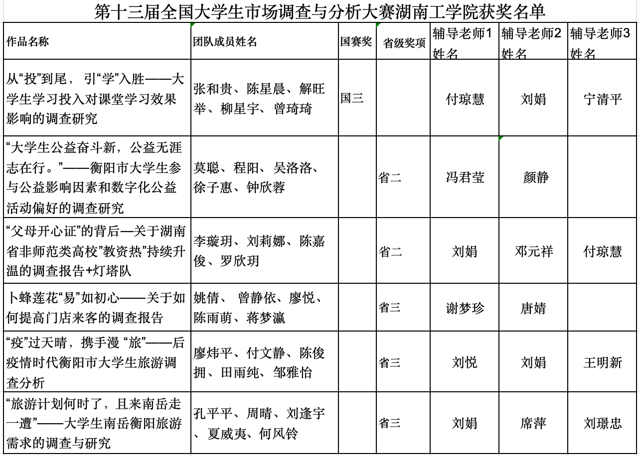 喜讯:英国上市公司官网365代表队在第十三届全国大学生市场调查与分析大赛上荣获国赛三等奖一项,省级二等奖二项,省级三等奖三项。具体名单如下: