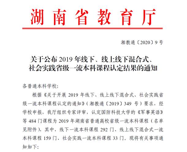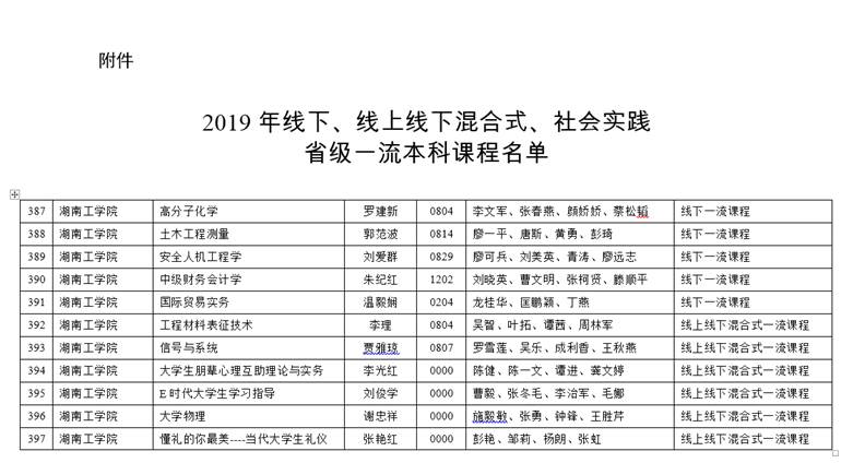 根据《关于开展2019年线下、线上线下混合式、社会实践省级一流本科课程认定的通知》(湘教通〔2019〕349号)要求,经各课程团队申报,二级教学单位初审,学校组织专家评审,英国上市公司官网365推荐的12门课程有11门通过了省级一流课程认定,其中,线上线下混合式一流课程6门,线下一流课程5门。