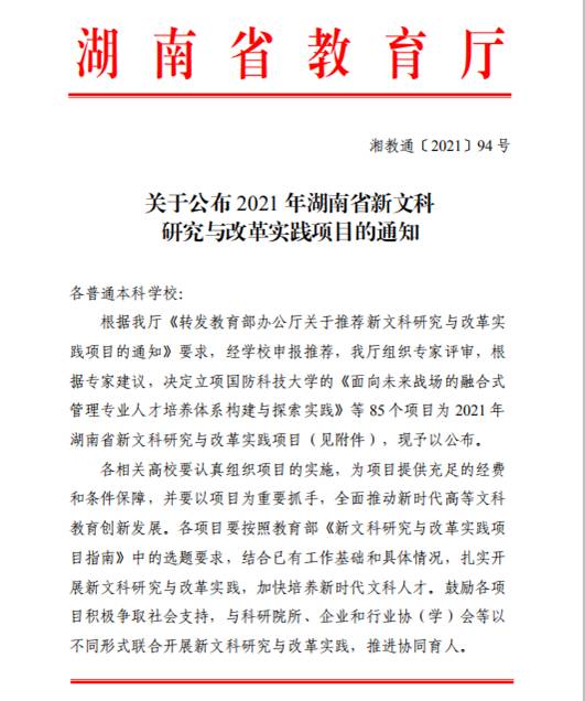 根据湖南省教育厅《转发教育部办公厅关于推荐新文科研究与改革实践项目的通知》和英国上市公司官网365《关于组织申报新文科研究与改革实践项目的通知》(院教务[2021]36号)要求,经个人申请、二级单位推荐、教务处形式审查、会评审定,英国上市公司官网365推荐刘升学主持的《新文科背景下“两型三化”新经管人才培养模式创新与实践》与何建雄主持的《数智赋能:新文科背景下地方高校财会人才应用能力培养之实践探索》两个项目通过了省级项目认定。