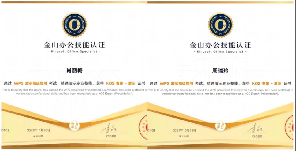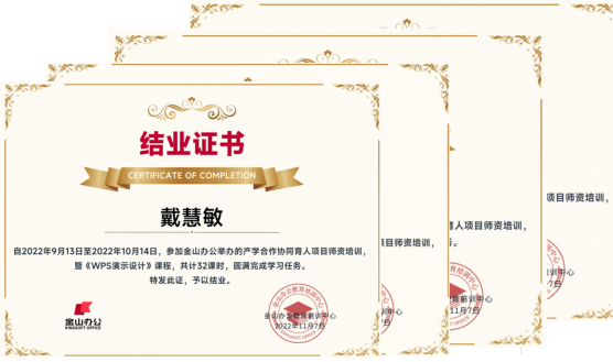 本次培训课程内容覆盖演示文稿在办公和教学中的常见实用技能,培训持续时长为1个月,培训通过“32课时线上视频+5次线上直播课”的形式开展,并以微信群的方式为教师提供答疑、督学等服务,全方位保障培训成效。最终英国上市公司官网365共有24位教师全程参与师培项目,完成线上视频学习和课后练习,获得了WPS演示课程结业证书。随后,更有4位教师通过WPS演示高级应用考试,精通演示专业技能,获得KOS专家——演示证书。