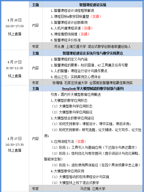 为贯彻落实全国教育大会和教育部高教司文件精神,推动人工智能赋能教育,培育及建设智慧课程、AI课程,有效推进混合式教学的深度落地,教师发展中心将组织“拥抱AIGC浪潮:高校智慧课程全流程孵化与AI驱动混合式教学创新工作坊”培训工作,现就有关事项通知如下: