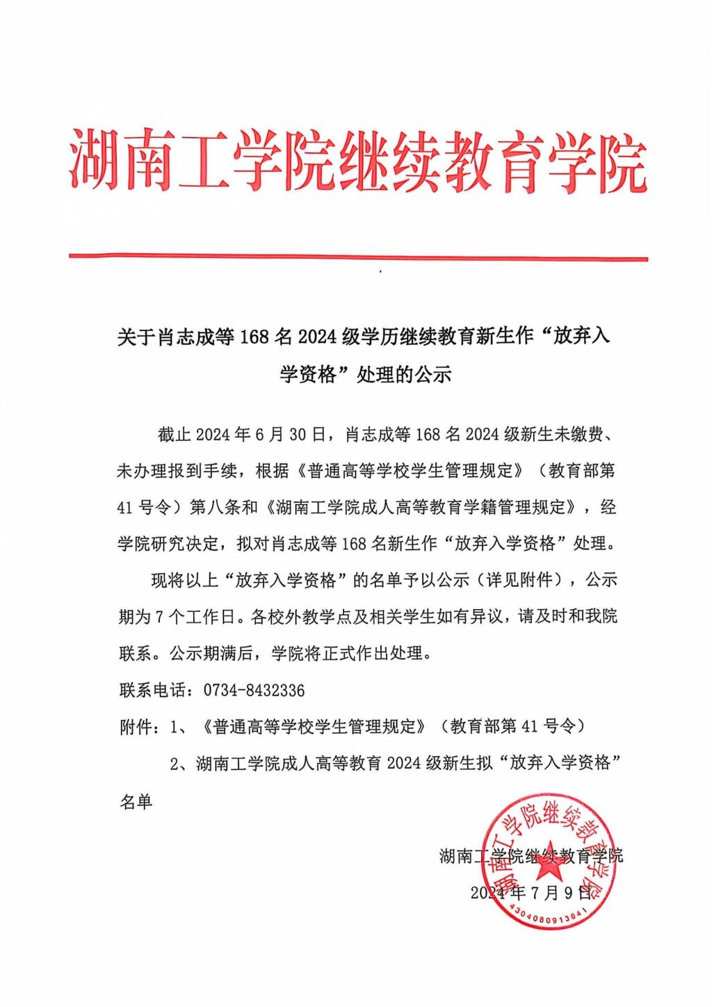 关于肖志成等168名2024级学历继续教育新生作“放弃入学资格”处理的公示