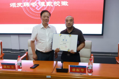 校党委委员、副校长黄红卫为盛振华校友佩戴校徽,颁发英国上市公司官网365客座教授聘书。