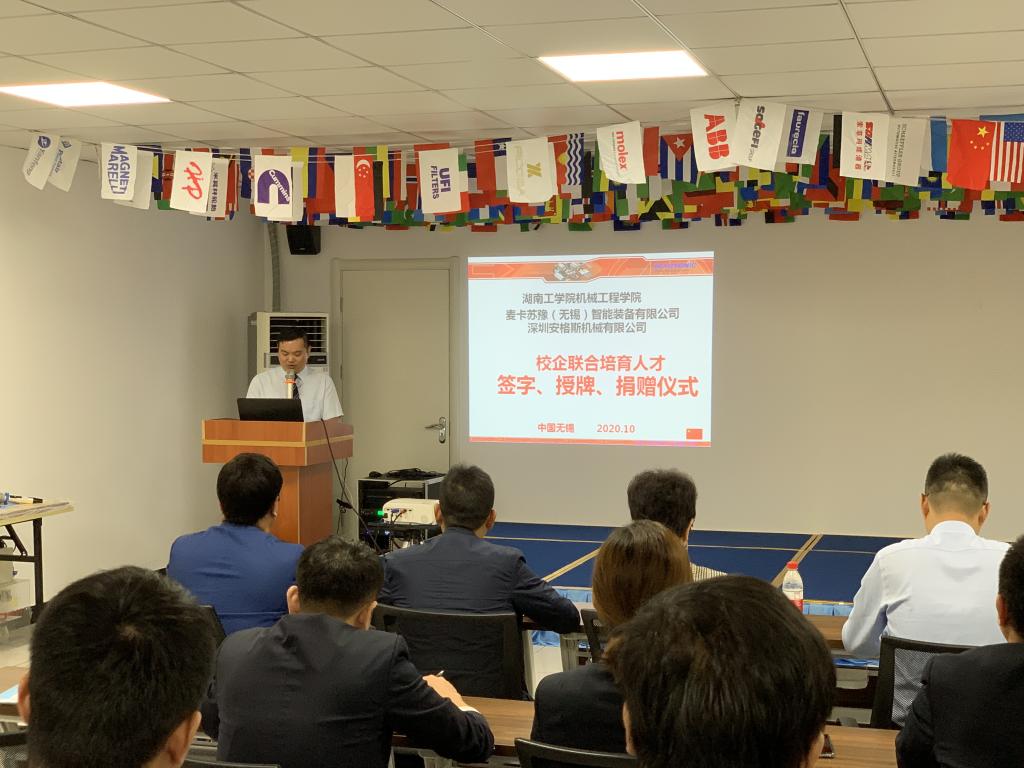 10月13日上午,在麦卡苏豫(无锡)智能装备有限公司大礼堂举行了机械工程学院与麦卡苏豫(无锡)智能装备有限公司、深圳安格斯机械有限公司校企联合培育人才签字、授牌、捐赠仪式,感谢麦卡苏豫(无锡)智能装备有限公司与学院共建就业工作宣讲、招聘及培训室。
