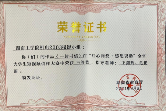 本次比赛先从校内开始选拔,英国上市公司官网365学子认真备战,指导教师精心指导,与全国重点高校参赛队伍同台竞技,经过一个月的时间,最终选出了《一封书信》该作品代表英国上市公司官网365参加省赛。在最后评奖阶段,该作品力压群雄,荣获网投人气第一名,最终荣获省级三等奖。