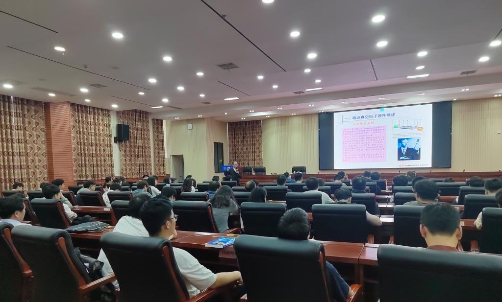 报告中,王勇教授从微波真空电子器件的概述、工作原理、团队研究成果、产业应用等方面,详细介绍了微波真空电子器件对国防武器装备的重要性。他指出,微波真空电子器件堪称国防武器装备的“心脏”,其性能水平直接决定了武器装备的技术和战术指标,亦是关系国家安全和社会发展的最重要的战略资源之一,已成为严重制约我国武器系统发展的瓶颈。讲座上,王勇教授着重阐述了微波真空电子器件的工作原理和未来研究的主要方向。报告结束后,王勇教授详细解答了师生们提出的问题,并鼓励大家将来研究微波真空电器器件,为祖国的国防奉献自己的一份力量。