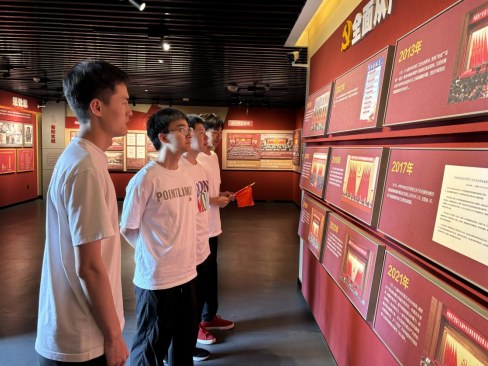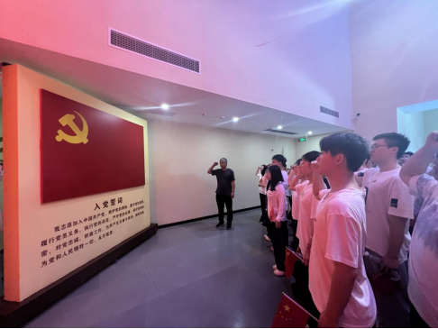 在党史馆,全体党员面对鲜红的党旗,重温入党誓词,表达自己为共产主义事业奋斗终身的决心。