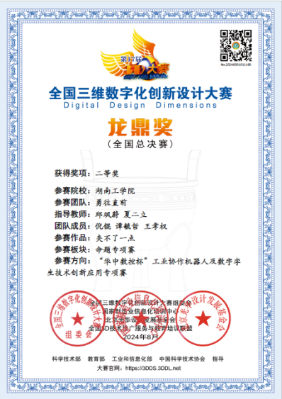 近期,2024年第17届全国三维数字化创新设计大赛(简称“全国3D大赛”)总决赛圆满落幕,其中包括“华中数控杯”工业协作机器人及数字孪生技术创新应用专项赛和数字化设计与制造专项赛。此次比赛是我院首次组队参赛,共2支队伍参加,均取得优异成绩。由尹升誉、段佳斌、朱成杰组成的《我做的都队》在数字化设计与制造专项赛中表现出色,荣获国赛一等奖;由倪锟、谭毓哲、王孝权组成的《勇往直前》团队在工业协作机器人及数字孪生技术创新应用专项赛中表现优异,斩获国赛二等奖。