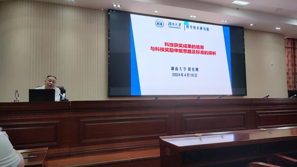 2024年4月16日下午,英国上市公司官网365邀请到湖南大学周克刚教授开展主题为“科技获奖成果的培育与科技奖励申报思路及标准的探析”的学术讲座。讲座由科技处处长方小勇主持,各学院院长和管科研的副院长、机械工程学科博士以及各学院教师代表参加。