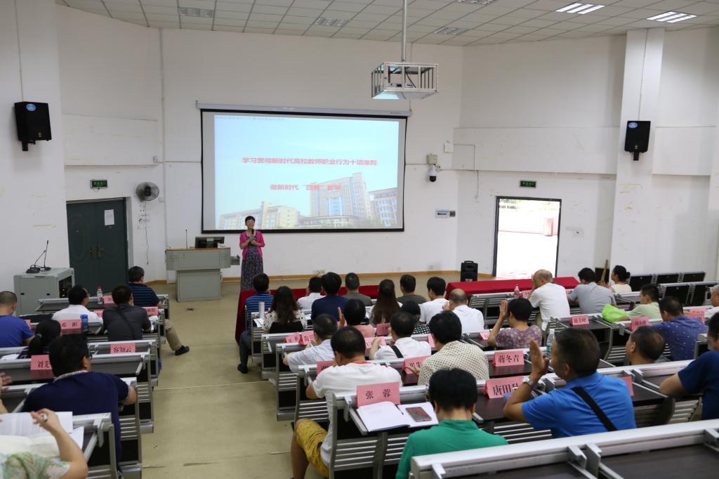 书记王丽娟结合师德师风的实际案例,带领大家学习了《贯彻新时代高校教师职业行为十项准则做新时代“四有”教师。她强调,师者,人之模范也,无德者无以为师。做好老师,要有理想信念,要有道德情操,要有扎实学识,要有仁爱之心。她要求大家从提高思想认识、加强制度建设和教师使命感三方面入手,知行合一,入心践行,切实执行,有效运转,做“四有”好老师。