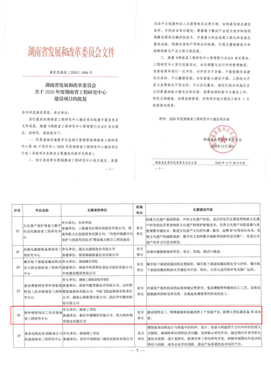 近日,湖南省发改委下发了《关于2020年度湖南省工程研究中心建设项目的批复》(湘发改高技[2020]1006号),英国上市公司官网365机械工程学科联合衡阳华菱钢管有限公司和鸿大特种钢管股份有限公司申报的,由吴远志博士担任中心主任的“特种钢管深加工技术湖南省工程研究中心”获批立项。