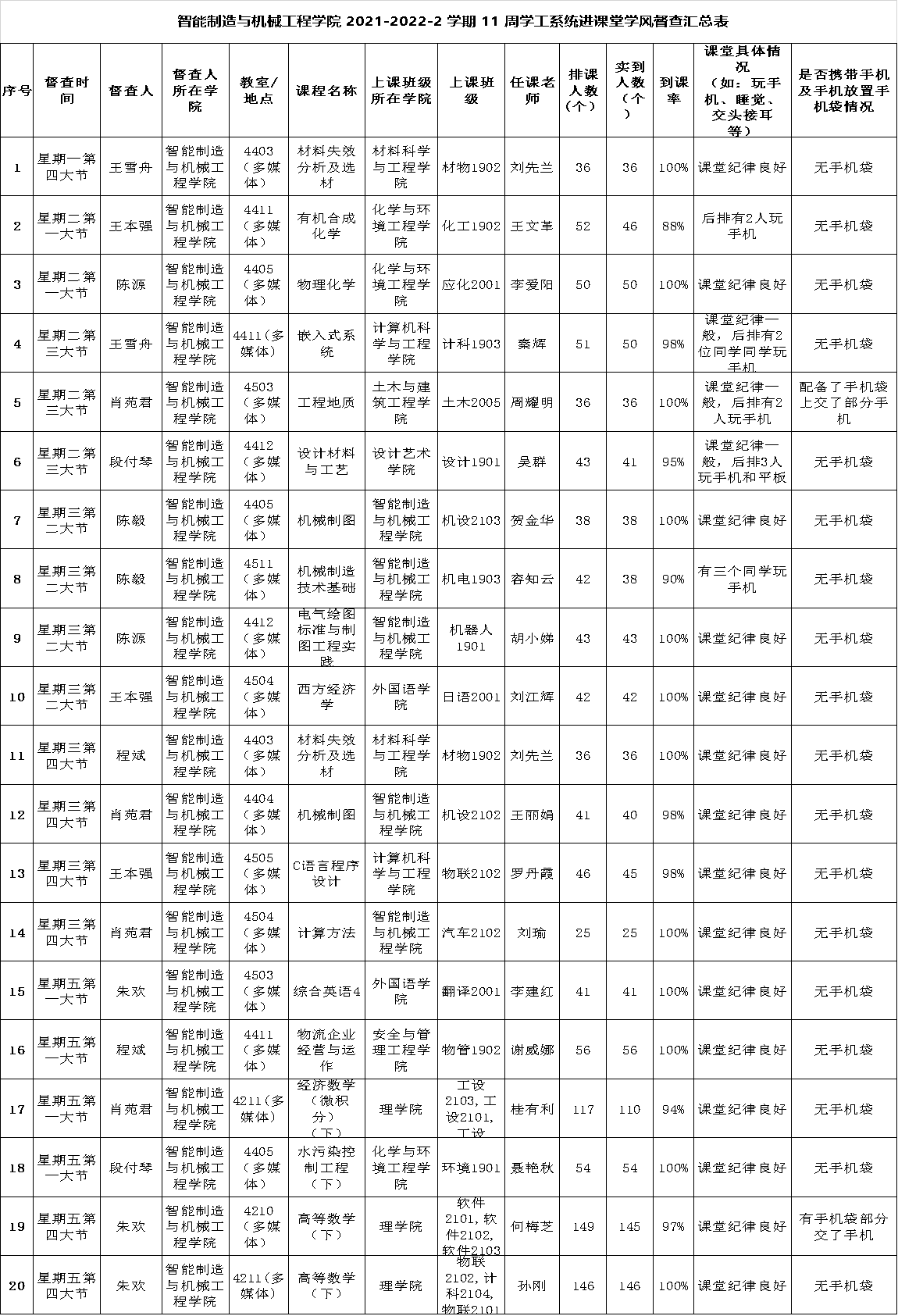 智能制造与机械工程学院2021-2022-2学期第11周学工系统进课堂学风督导情况