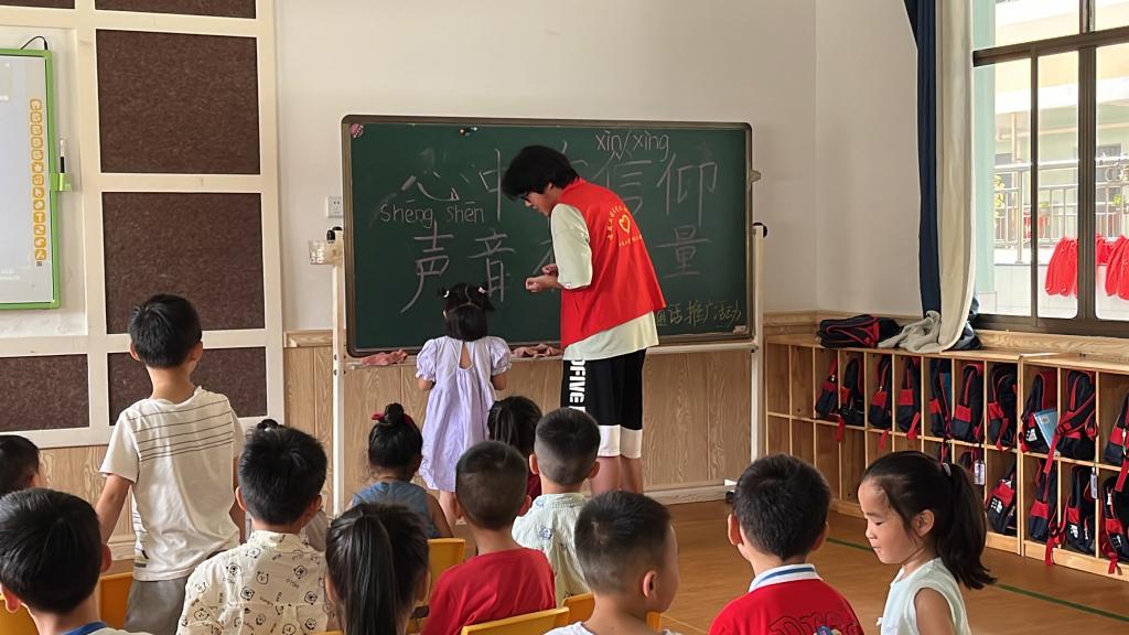 深入课堂进行推普,童声洋溢齐叙中国。实践团在衡南县红太阳幼儿园进行“心中有信仰,声音有力量”的推广普通话活动,与小朋友们友情互动,讲解普通话小知识,为其讲述普通话作为共同语言,有助于增进跨地域、跨文化的交流,促进文化多样性与社会和谐的重要性。